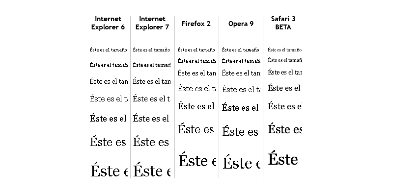 Al trabajar con texto, podemos encontrarnos con algunos cuando asignamos tamaños basados en unidades relativas o porcentajes a los tamaños de fuente. Yo suelo definir para el body de un documento un tamaño en ems, y especificar los tamaños de los encabezados en porcentajes. Lo que ocurre es que los navegadores, al realizar el cálculo del tamaño final de los encabezados pueden verse obligados a redondear el valor, puesto que no puede haber fracciones de píxeles. En consecuencia, dependiendo de si el redondeo es a la alza o a la baja, pueden presentar aspectos diferentes en virtud del navegador. Pero a pesar de que la especificación deja al agente de usuario la responsabilidad de decidir los tamaños de fuente correspondientes a cada una de las palabras clave, la verdad es que los resultados en los navegadores actuales son bastante similares entre sí, como muestran las pruebas con el primer ejemplo: