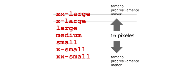 La especificación dice que los tamaños absolutos1 son una serie de valores calculados por el agente de usuario que, tomando el valor por defecto para el tamaño de fuente —16 píxeles en los navegadores modernos— como medium, dan lugar a una tabla en la que los valores entre small y xx-small son progresivamente más pequeños, y entre large y xx-large progresivamente más grandes.