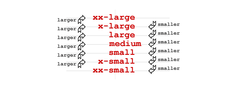 larger y smallerEs decir, que si un padre tiene un valor de small, el valor larger aplicado al hijo hace que el small heredado se convierta en medium. Un xx-small equivaldría a un x-small, un large equivaldría a un x-large, y así sucesivamente.