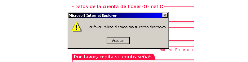 Aunque creo que ya se han desterrado en este siglo —espero no estar proyectando mis deseos—, no hace tanto no era infrecuente encontrarse con que al enviar un formulario se nos comunicaban los errores por medio de ventanas de alerta de JavaScript, al estilo de ésta: