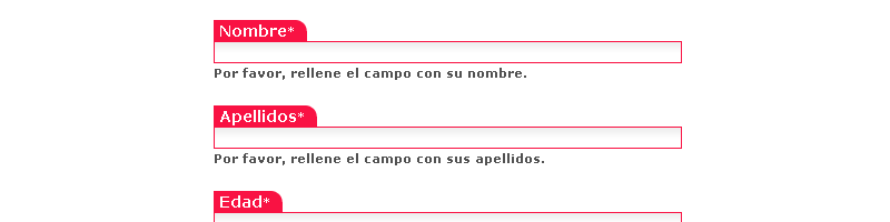 alt, pero eso es imposible si la imagen pertenece a la hoja de estilo y no al marcado del documento.src de la imagen se modifica para que ésta se sustituya por otra que cuenta con el texto de advertencia. En el mejor de los casos, si se atiende al punto 6.2 de las WCAG 1.0 (inglés), este método presenta el problema que indicaré para la técnica 3; en el peor, estamos en la misma situación que para la técnica 1.Como prueba, navego por el formulario con JAWS 6.20 sobre Internet Explorer 7: entro en el modo de formulario, y salto del campo de los apellidos al de la edad sin rellenar ningún dato. Lo que oigo es: «ENTER modo formulario activado TAB apellidos asterisco TAB edad asterisco». Como se ve, JAWS no ha leído el mensaje de «Por favor, rellene el campo con sus apellidos».