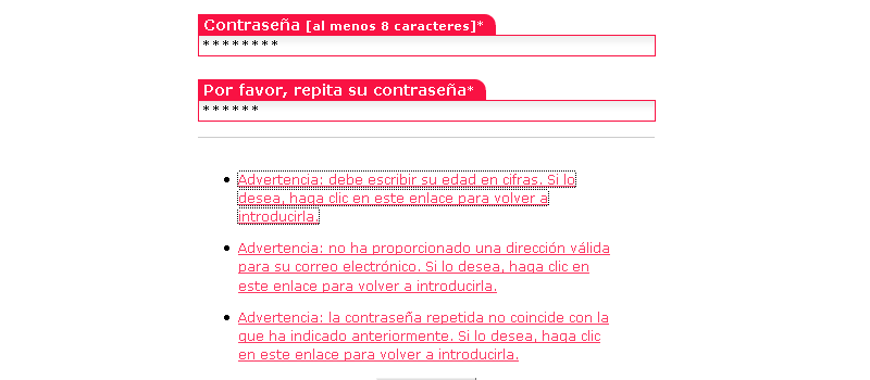 Al terminar de navegar por los campos con JAWS, el lector recorre la lista de advertencias. Lo que oigo es: «por favor repita su contraseña asterisco cuadro de contraseña escriba texto TAB advertencia falta completar el campo con su nombre si lo desea haga clic en este enlace para introducirlo enlace».